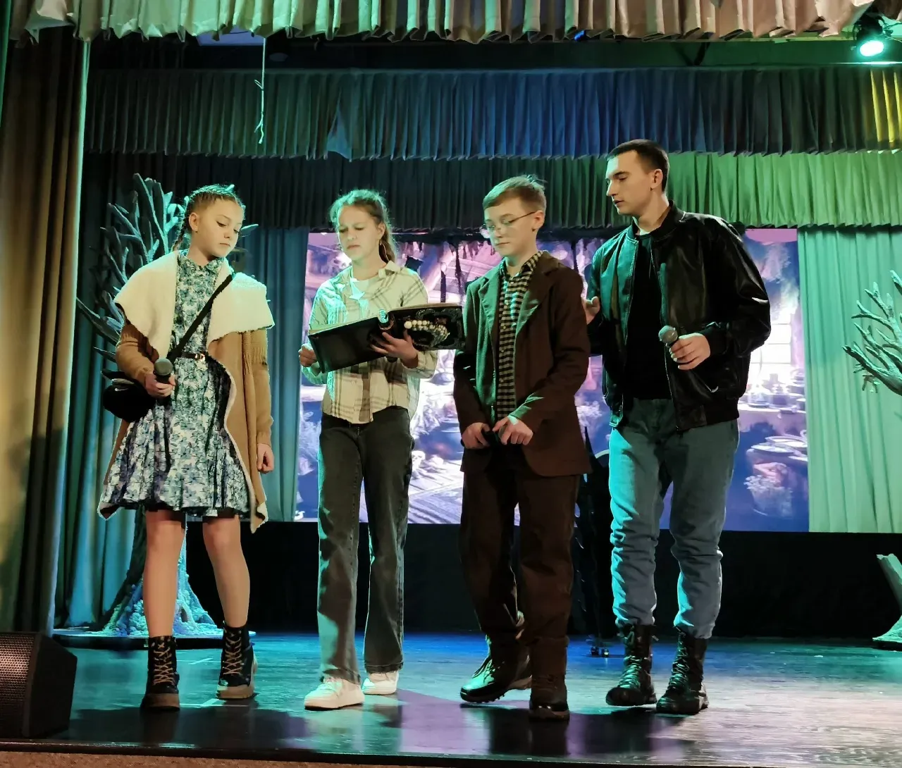 И так, четверо друзей Вика, Маша, Дима и Саша в предновогодние дни решили заглянуть в свое будущее. И гадать главные герои этой истории решили одним из самых древних способов – с помощью разноцветных свечей. Но свечи оказались совсем необычными – их волшебное пламя отправило ребят на приключения. Так они оказываются в незнакомом и немного жутком месте. И здесь появления друзей, как оказалось, очень ждут Призрак зимы, Волшебный лес и другие его обитатели, заколдованные злыми чарами. И именно Вике с друзьями суждено спасти их. Так предсказала Ворожея. На этом непростом пути, полном испытаний и опасностей, ребята встречают разных героев. Одни из них вызывают улыбку, другие – навевают ужас и страх. Но там, где есть настоящая дружба, вера и доброта, злые чары рассеиваются. Так произошло и в этой истории. Ребята преодолели все испытания и смогли вернуть в волшебный лес зиму, а вместе с ней и главный зимний праздник – Новый год. А он просто невозможен без самого мудрого и важного волшебника Деда Мороза, появление которого зал встречал аплодисментами.